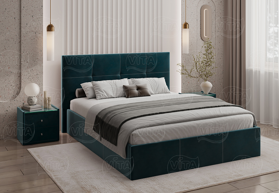 Кровать Ева с ортопедическим основанием и механизмом для подъема. Ящик для белья с прочным дном. Обивка выполнена из износостойкой ткани различных цветов и текстур.